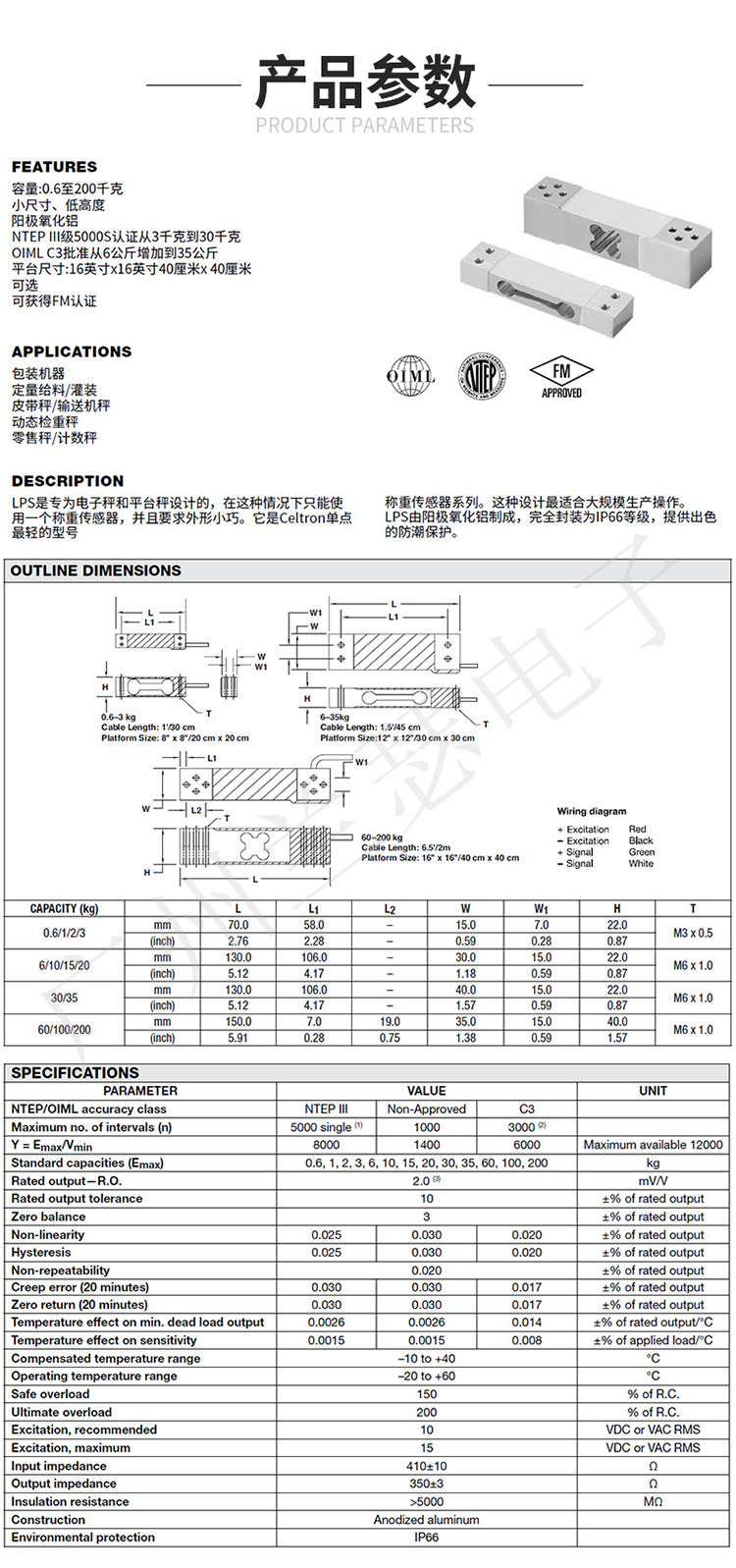 美国世铨Celtron LPS单点式称重传感器所有量程: